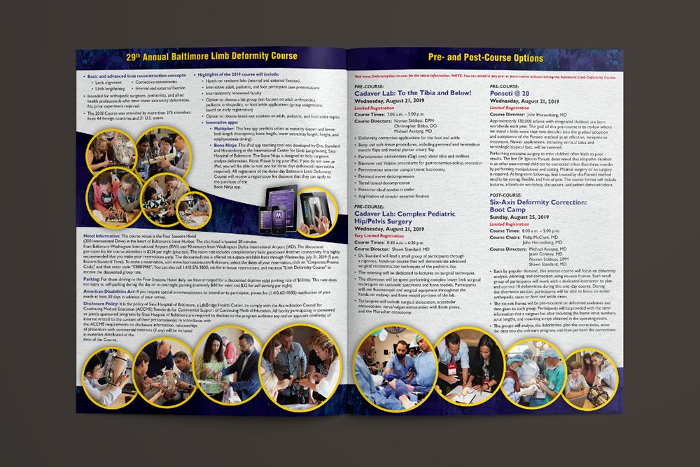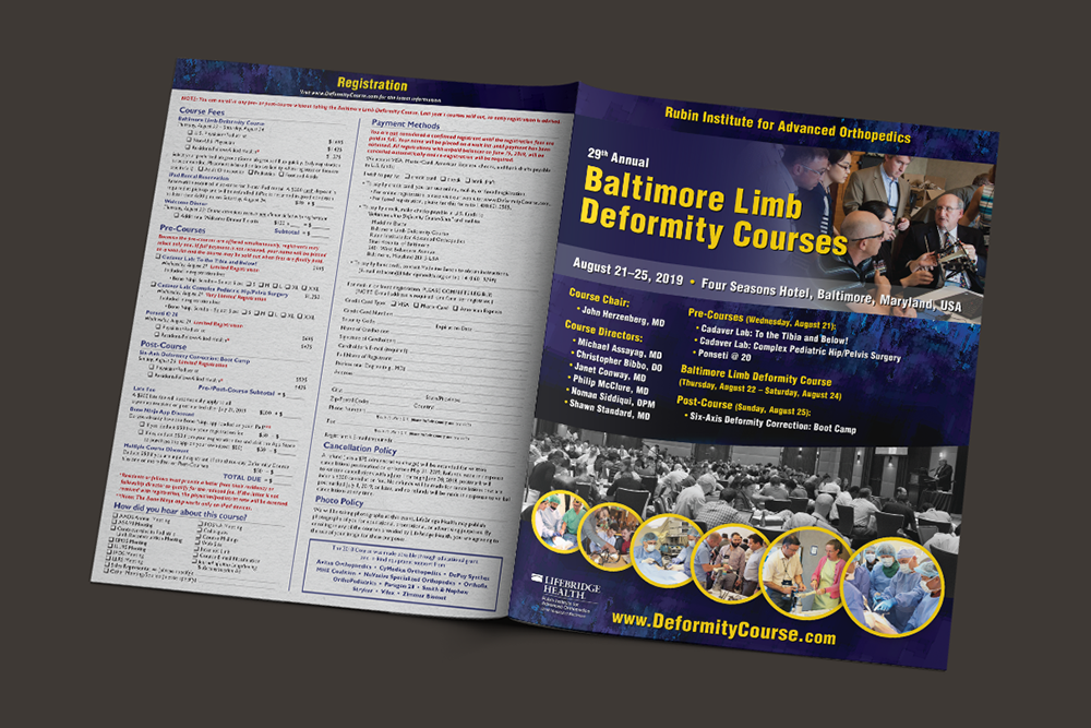 The Baltimore Limb Deformity Course (BLDC), an annual conference organized by the Rubin Institute for Advanced Orthopedics, has advertising booths at various orthopedic conferences throughout the year. I designed this brochure to show the hands-on learning that is offered at the BLDC by including many photos of participants being taught limb alignment and deformity correction techniques.