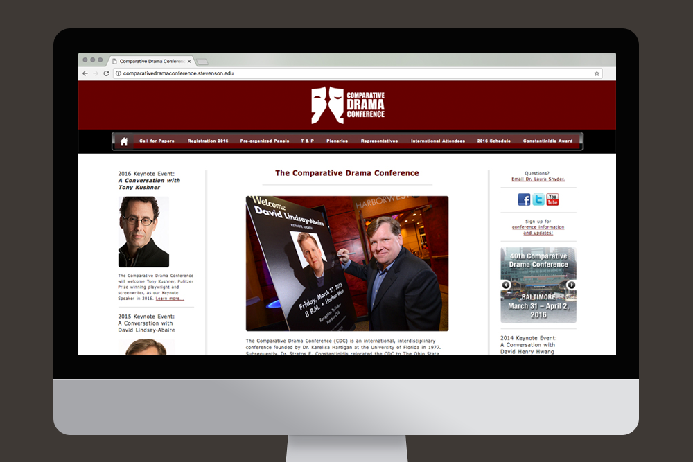 The Comparative Drama Conference, an international conference where scholars discuss works in the field of drama, was hosted by Stevenson University from 2012 to 2016. I redesigned the conference website and regularly updated it with information pertaining to each year’s event. The website can be viewed here.